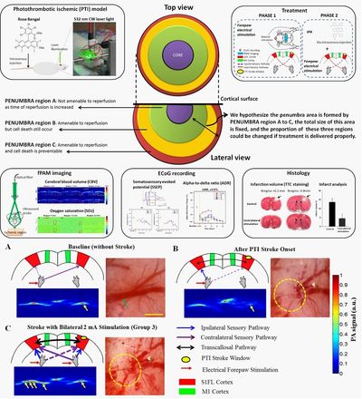 This study focuses on investigating the cerebral neurovascular function changes affected by hyperacute ischemic stroke, as well as the progressive changes of the affected cortical regions (i.e., ischemic core and penumbra). Using the developed novel combination of electrocorticography (ECoG) recordings and functional photoacoustic microscopy (fPAM) imaging (i.e., ECoG-fPAM) we investigate cortical functions after photothrombotic ischemia (PTI) in a rat ischemia model. The cortical functions are assessed over a chosen ischemic region via somatosensory-evoked potential (SSEP), resting-state ECoG signals (i.e., alpha-to-delta (ADR) ratio) and evoked hemodynamic responses (i.e., cerebral blood volume (CBV) and hemoglobin oxygen saturation (SO2)). Histological assessment method (2, 3, 5-triphenyl-tetrazolium chloride (TTC) staining) is also used to assess the infarct volume induced by ischemia. In addition, the neuroprotective effect of sensory stimulation as a non-invasive therapeutic intervention for hyperacute ischemia is evaluated in the affected animals.