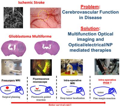 The NeuroPhotonics group is involved in both technology development and conducting experiments to validate the technology in basic and clinically relevant translational models. We are developing A) Laser speckle imaging technology, both for in situ imaging of brain function and a head-mounted imager microscope for imaging brain health and disease in awake-behaving animal, and B) Photoacoustic imaging system for monitoring brain vessels, blood flow and oxygenation at depth and a handheld imager for eventual translation to intraoperative imaging. We use nanoparticles for contrast enhancement, penetrating blood brain barrier, and for drug/oxygen delivery. Our focus is on two applications, A) stroke and B) glioblastoma brain tumor.